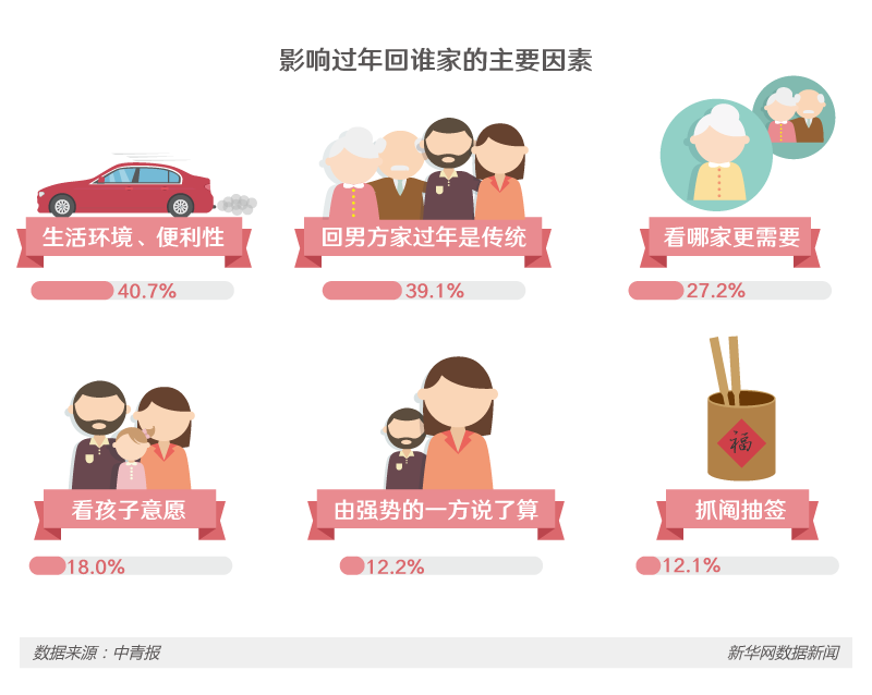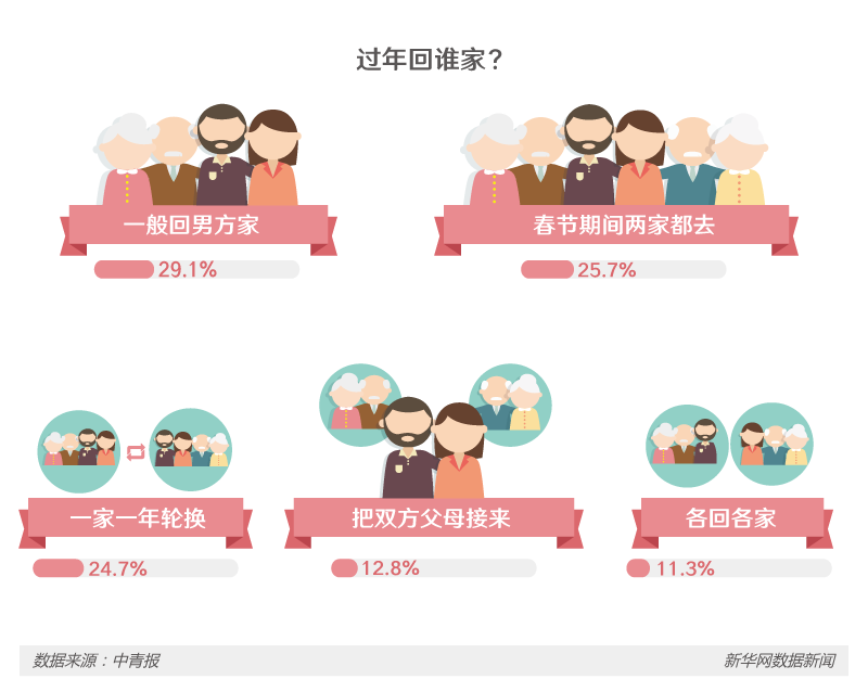 相關(guān)調(diào)查數(shù)據(jù)顯示,將近30%的受訪者表示目前一般都是回男方家過年;但實際上,大部分人心里都希望采取“輪流制”,一年一家,或者干脆把父母接過來一起過年,但考慮到父母身體條件或自身居住條件等原因,只得作罷。