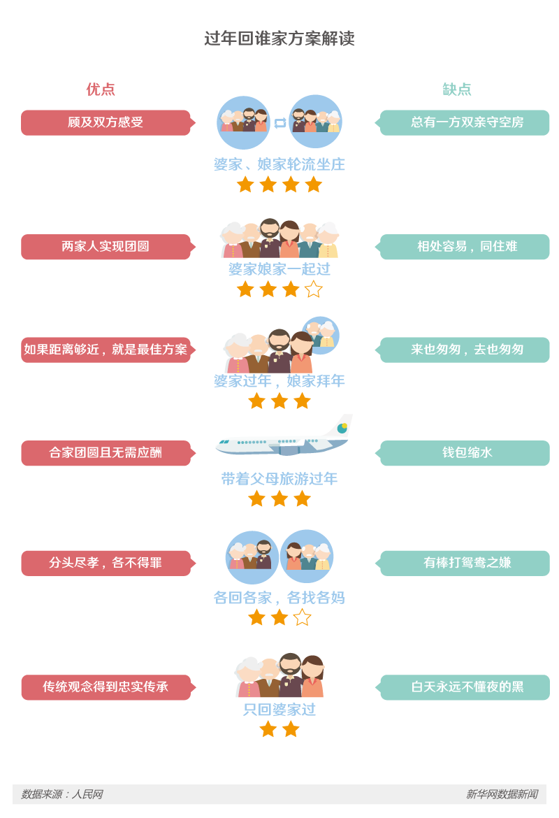 夫妻爭著回自己家陪父母過年,出發(fā)點都是為了盡孝,但若因此導(dǎo)致感情出現(xiàn)問題,甚至讓婚姻出現(xiàn)危機,就未免舍本逐末。在此小編就對夫妻過年回家的幾種解決方案做個“評估”,供大家參考: