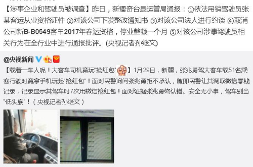 1月29日,新疆,張兆勇駕大客車載51名乘客行駛時竟拿手機玩起“搶紅包”!面對民警詢問張兆勇拒不承認,隨即民警讓其調取微信零錢記錄,記錄顯示其駕車時7次用微信搶紅包!面對證據張兆勇終認錯。