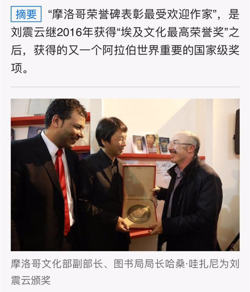 報道不僅引用了摩洛哥文化部的頒獎詞以及劉震云的答謝詞,還配上了一張?zhí)柗Q摩洛哥文化部副部長為劉震云頒獎的照片,幾乎看不出任何破綻。