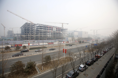 起重機、大吊車、匆忙穿梭的工人……副中心行政辦公區建設工地上,一派繁忙。正在施工的樓宇框架上,排排紅色條幅“世界眼光、國際標準、中國特色、高點定位”格外顯眼。