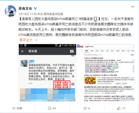 連日來,微博、微信朋友圈有消息稱:“淮南一市民昨天下午因吃大盤雞感染H7N9死亡,25歲,孩子1歲,參與搶救的醫生已被隔離,緊急通知,暫時別吃雞肉鴨肉。因安徽渦陽縣5570頭家禽已感染。收到馬上發給你關心的人,預防永遠勝過治療。看到,群發擴散。”19日,安徽省淮南市人民政府通過官方微博辟謠稱:“目前淮南市沒有發現人感染H7N9禽流感的死亡病例,朋友圈瘋傳的淮南市市民因感染H7N9病毒死亡的消息為假消息。