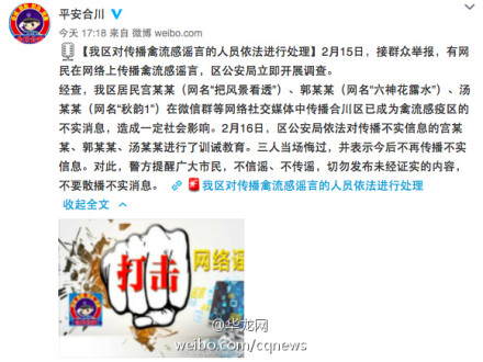 重慶合川3網民傳播禽流感謠言,被警方依法進行處理。重慶市合川區公安局官方微博@平安合川 發布通報,2月15日,接群眾舉報,有網民在網絡上傳播禽流感謠言,合川區公安局立即開展調查。經查,合川區居民宮某某(網名“把風景看透”)、郭某某(網名“六神花露水”)、湯某某(網名“秋韻1”)在微信群等網絡社交媒體中傳播合川區已成為禽流感疫區的不實消息,造成一定社會影響。