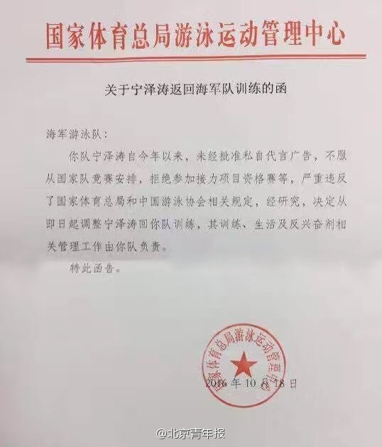 今天有媒體曝光了國(guó)家體育總局游泳運(yùn)動(dòng)管理中心致海軍游泳隊(duì)的一封信函,稱“寧澤濤因?yàn)檫`反多項(xiàng)隊(duì)規(guī)及私接廣告等原因被調(diào)整回海軍隊(duì)進(jìn)行訓(xùn)練”。