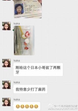 劉醫(yī)生:其實根本沒有少打麻藥。我很負責的把那個日本小伙子的牙拔了,他并無任何疼痛,走的時候還感謝了我。不過我承認自己是有點無聊,看到日本人,而且還帶著護照,就想和別人開個玩笑。就拍了張照片,然后發(fā)在了一個微信群里,想和大家調侃一下,就說少打麻藥了,就是無聊的心理。