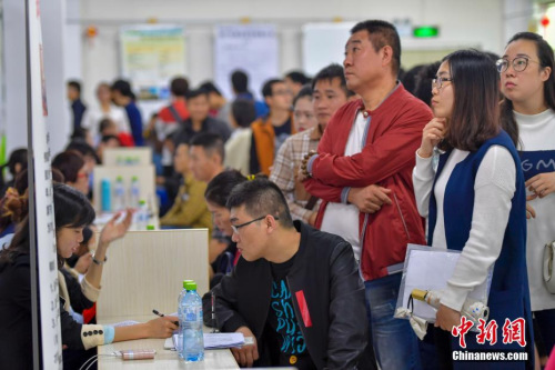 資料圖:2017年2月11日,北京國(guó)際會(huì)展中心舉行春季人才招聘會(huì),求職者在招聘會(huì)尋找合適的就業(yè)崗位。中新社記者 韓海丹 攝