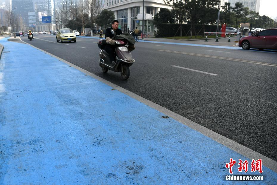 2月28日,成都市高新區吉泰路車來車往,道路兩側的非機動車道被涂上天藍色后尤為醒目。據了解,這條藍色非機動車道由成都市高新區近日打造,為騎行者推出的“健康道”。 中新社記者 張浪 攝