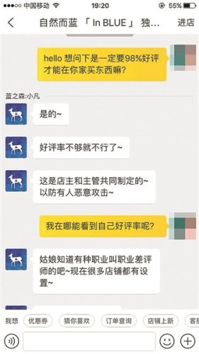 一家名為“自然而藍(lán)”的店鋪主營(yíng)服裝類(lèi)商品,北青報(bào)記者以顧客身份進(jìn)行詢(xún)問(wèn),客服稱(chēng),買(mǎi)家發(fā)出的好評(píng)率要在98%以上,才可以在店中購(gòu)買(mǎi)。“好評(píng)率不夠就不行了,這也是店主和主管共同制定的,以防有人惡意攻擊。”客服人員稱(chēng),目前有很多家店鋪都有類(lèi)似設(shè)置,“因?yàn)橛蟹N行當(dāng)叫職業(yè)差評(píng)師,所以很多家店鋪都會(huì)設(shè)置,只是標(biāo)準(zhǔn)不一樣,算是不成文的規(guī)矩。”