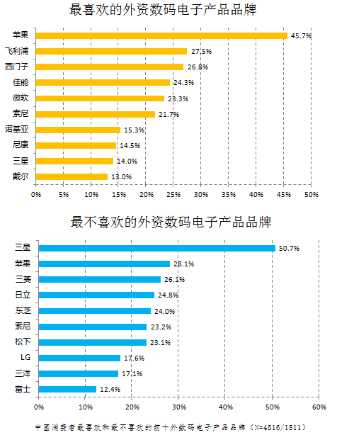 2017年的調(diào)查顯示,蘋果(Apple)是受訪者最愛(ài)的外資數(shù)碼電子產(chǎn)品品牌,提及率為45.7%;其他外資數(shù)碼電子品牌的受歡迎度與蘋果相比只能相形見(jiàn)絀。具體而言,飛利浦以27.5%的提及率排名第二位,排名第三位的是西門子(26.8%)。佳能與微軟排位第四五位,提及率分別為24.3%和23.3%。