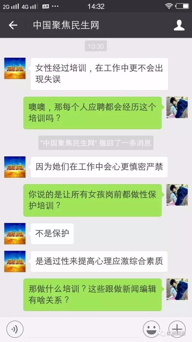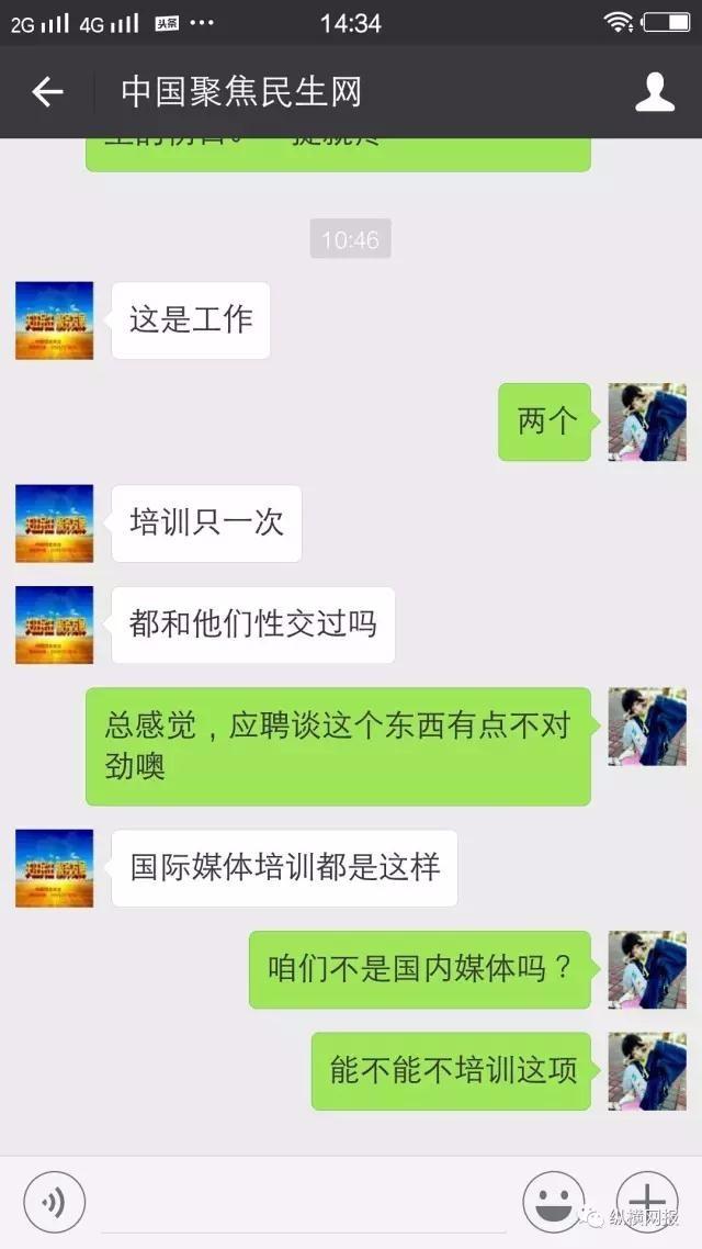 “《中國聚焦民生網》網站總監周某某以招聘編輯為由,對應聘女孩進行性騷擾,且語言頗為露骨,還稱是國際綜合媒體領域頂尖技能培訓……”