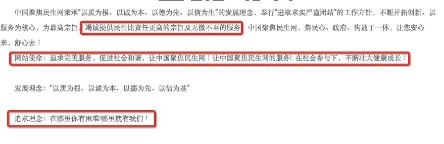 網站“追求完美服務,促進社會和諧,讓中國聚焦民生網!讓中國聚焦民生網的服務!在社會參與下,不斷壯大健康成長!”,以“在哪里你有困難!哪里就有我們”當作網站的使命。