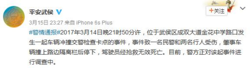 中新網3月16日電 據成都市公安局武侯區分局官方微博消息,2017年3月14日晚21時50分許,四川成都武侯區成雙大道金花中學路口發生一起車輛沖撞交警檢查卡點的事件,事件致一名民警和兩名行人受傷,肇事車輛撞上路邊隔離欄后停下,駕駛員經搶救無效死亡。