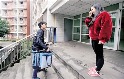 一件黑色的外套,稍顯青澀的臉龐,說起話來有些羞澀,記者見到他時,他正斜挎著送餐包在樓棟之間穿梭。每天上午11點至中午1點半的午餐時間,是他最忙碌的時候。