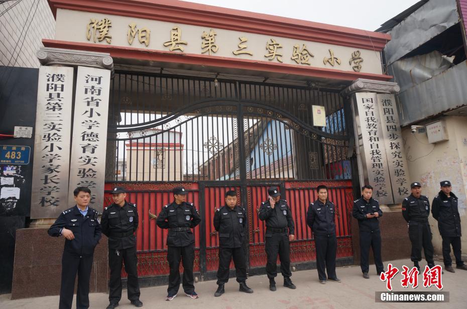 3月22日,河南濮陽縣第三實驗小學(xué)老校區(qū)發(fā)生學(xué)生踩踏事故,官方通報稱,截至15時,事故共造成22名學(xué)生受傷,其中一人送醫(yī)途中死亡,5人重傷,傷者正在醫(yī)院救治。記者當天下午三點到達事發(fā)學(xué)校,了解到事故原因是:該校當天舉行全校月考,學(xué)生在早上8點半考試前大量集中上廁所,在從二樓下到一樓時有學(xué)生跌倒,發(fā)生踩踏。圖為事故發(fā)生后學(xué)校已經(jīng)停課,武警在校門口戒嚴。 韓章云 攝