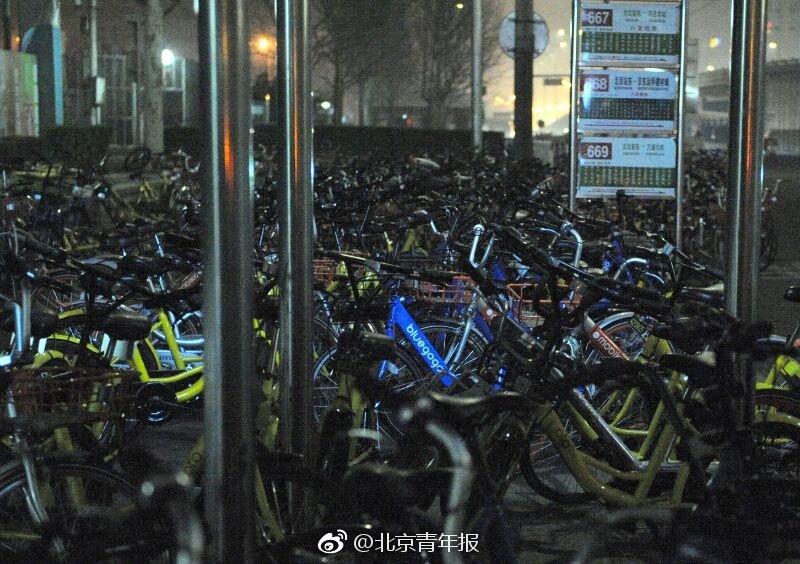 據北京青年報官方微博報道,22日晚高峰后,CBD的北京八王墳東公交車站被上千輛共享單車“圍困”,長達百米的公交站區域被多個“單車群”占據。北青報記者夜間探訪發現,眾多單車已停在了行車道上,部分單車因影響公交車出站,被人扔進了“車叢”中。除某一家公司的部分單車,疑似有人整理或專門投放于此,其他幾家公司的單車停放較為雜亂。但各公司的車均占據了站臺、人行道和行車道,嚴重影響公交進出站。