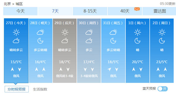 中國天氣網訊 今天(27日)北京在碧藍如洗的燦爛晴空中迎來新的一周,預計隨著天氣回暖,本周北京氣溫將逐漸升高,周末最高氣溫有望達20℃以上,此前被冷空氣中斷的入春進程有望重新啟動。