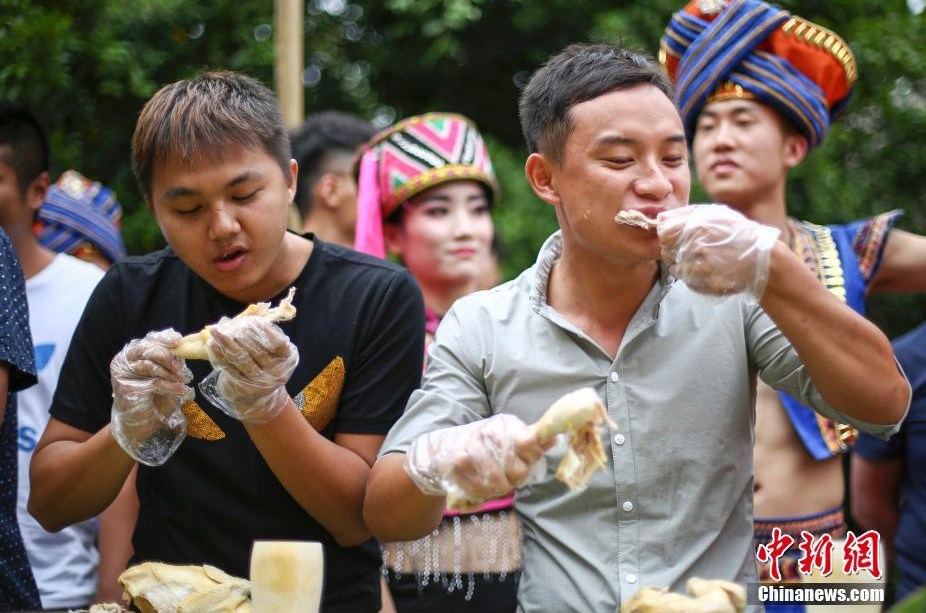 3月28日,為迎接海南黎苗三月三的到來,三亞千古情景區設“百雞宴”邀請千名游客同時品嘗文昌雞、喝山蘭酒,體驗海南特色美食風俗。現場還舉辦了充滿趣味的“吃雞大賽”,來自海南三亞的陳先生僅用3分鐘吃完一只雞,獲得比賽冠軍。圖為參加吃雞大賽的游客。