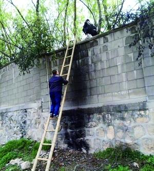 4月2日下午1時許,這位婦女打電話詢問后稱,可以帶人過去,但需要交10元的車費。記者同意后,這位婦女開著摩的,將兩名記者拉到西安秦嶺野生動物園旁的內(nèi)苑村村子里,在一個緊挨著圍墻的路邊,有三個年輕小伙子在墻邊架著4米多高的竹梯,三人陸續(xù)上墻頂后,將另外一個竹梯搭在另外一邊,其中一人坐在墻頂,另外兩人進(jìn)入園區(qū)內(nèi)看有無安保人員經(jīng)過,確認(rèn)無誤后招呼記者上墻進(jìn)入園區(qū)(如圖)。