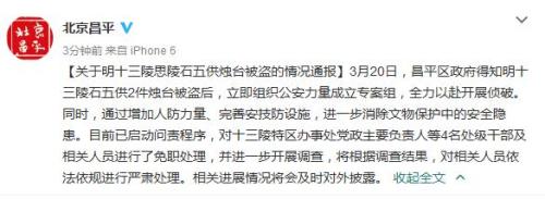 北京市昌平區(qū)官方政務(wù)微博今日晚間發(fā)布消息稱(chēng),3月20日,昌平區(qū)政府得知明十三陵石五供2件燭臺(tái)被盜后,立即組織公安力量成立專(zhuān)案組,全力以赴開(kāi)展偵破。同時(shí),通過(guò)增加人防力量、完善安技防設(shè)施,進(jìn)一步消除文物保護(hù)中的安全隱患。