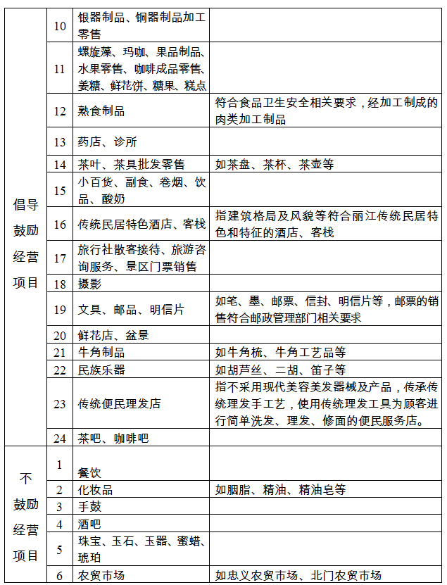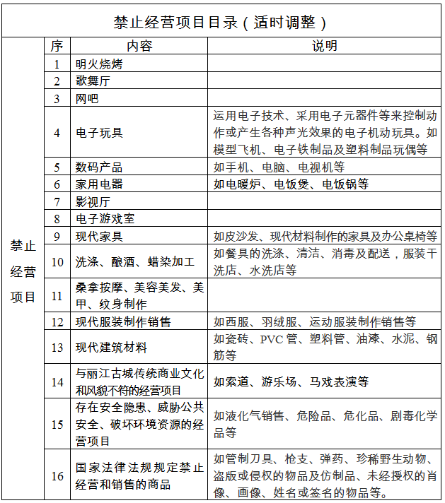 禁止經營項目是指與遺產風貌保護、麗江古城傳統商業文化不符,以及存在安全隱患、國家明令禁止經營的經營項目。