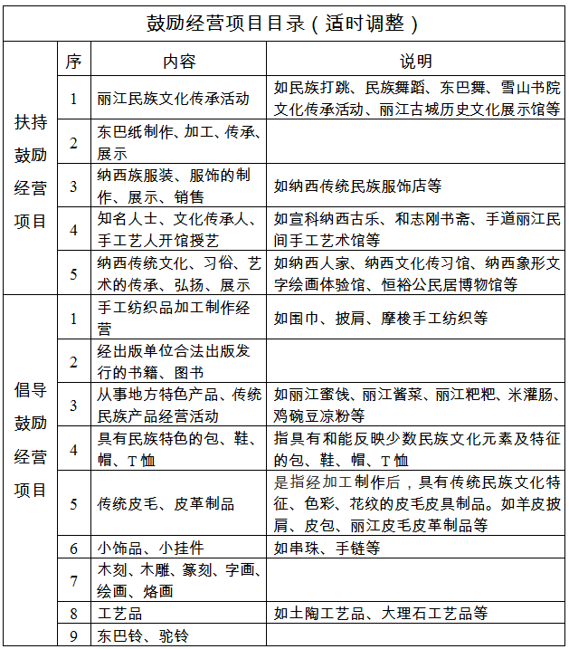 鼓勵經營項目是麗江古城文化遺產保護的重要內容,通過實物、圖片、音像、表演等形式對民族文化進行宣傳和介紹,以及傳統手工藝制品、地方特色產品和傳統民族產品的加工、制作及銷售等。
