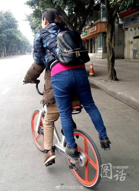 最近,成都的共享單車界,出現(xiàn)一波“花式載人”的節(jié)奏:有坐車筐上的,有站鏈條蓋上的,有站(坐)后輪胎蓋上的,還有倆人“共享”車座的……