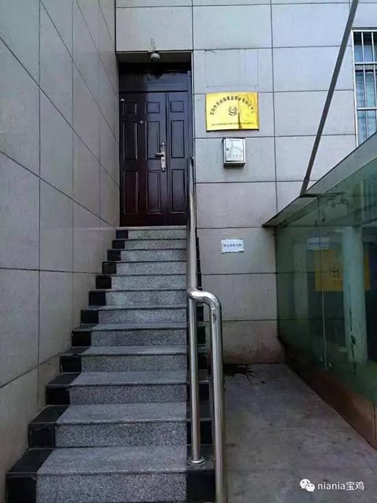 陜西寶雞市勞動(dòng)保障監(jiān)察舉報(bào)投訴中心門(mén)前,一個(gè)舉報(bào)箱被釘?shù)谩案吒咴谏稀保嚯x地面3米高,門(mén)口還有監(jiān)控?cái)z像頭。