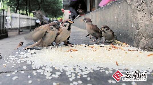 孔霖輝說:“幾天后,我發現店外有幾只麻雀來撿拾我家狗吃剩的東西,十分可憐。想起以前昆明城周邊都有稻田,麻雀不愁吃,現在麻雀在城里生存困難,我就拿出一些米來喂它們,它們也不客氣,見了就吃。一來二去,我們就熟了。”