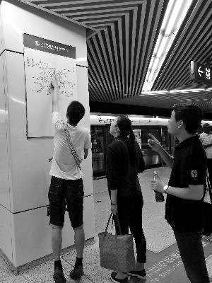 在地鐵惠新西街南口站下車后,記者看到方形的柱子一側張貼著的“北京城市軌道交通線網圖”標牌,圖中站名都是小號字體。記者身高一米六出頭,但頭頂距離線路圖最底端仍有一段距離。