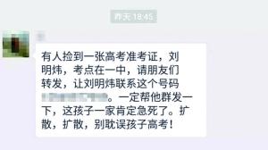 昨天,北京晨報記者在微博和微信朋友圈內看到多人轉發的“劉明煒的準考證失物招領信息”,文中寫道:“朋友撿到一個準考證,有認識的通知一下:姓名:劉明煒,考點:一中,考場:013,座號:11,準考證號:204101311。聯系電話18735078xxx。擴散,擴散,別耽誤孩子高考”。大部分轉發的市民表示,并未親身撥打電話,僅僅是善心轉發。此后,記者撥打消息中的聯系電話,但語音提示對方已關機。通過搜索可以看到,此號碼歸屬地為山西。