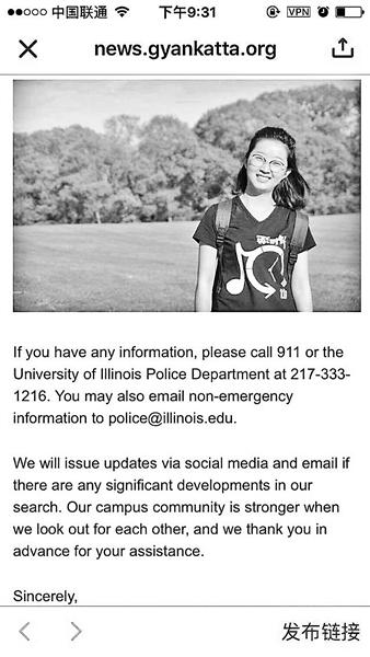 美國當地消息也肯定了這一點,根據章瑩穎在UIUC的指導教授管教授稱,章瑩穎在9日中午左右離開實驗室大樓,她計劃前往位于林肯大道上的公寓簽訂新的租屋合約。