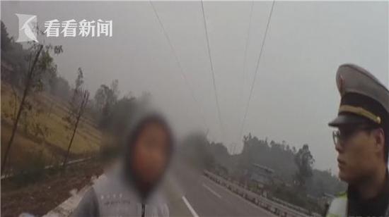 執法人員發現男孩后,立即靠邊停車,指揮行駛車輛減速通過,將男孩帶到了安全地帶。
