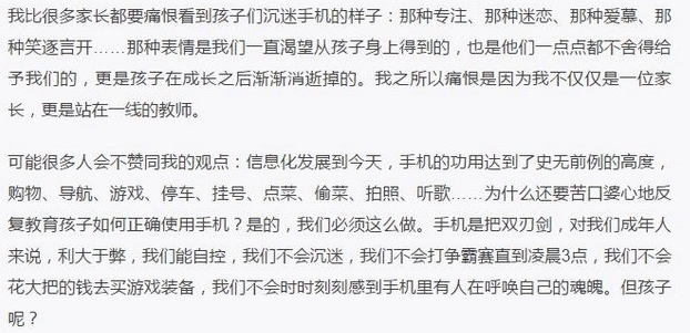 蔣老師在文中不無擔憂地表示,在沒有智能手機的時代,“黑網吧”是迫害孩子的“兇手”,現在智能手機普及,手機游戲產業繁榮發展,智能手機游戲成為了新時代的“黑網吧”。