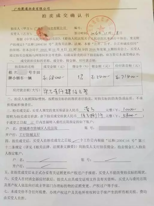 2016年11月8日,南寧盧先生參與防城區(qū)人民法院組織的一起司法拍賣,以7.14萬元(成交價6.8萬元,拍賣傭金3400元)的價格,競拍到一輛黑色豐田牌皇冠轎車。
