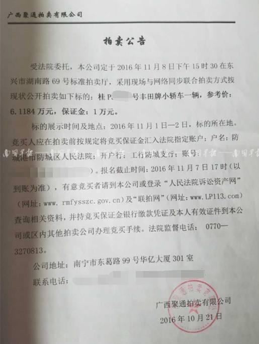 7月14日,負(fù)責(zé)該車拍賣的廣西聚通拍賣有限公司相關(guān)人員表示,防城區(qū)人民法院提供的委托書及評估書上,沒有對該車的報廢情況進(jìn)行說明,他們無從了解。不過,根據(jù)相關(guān)法規(guī),如果拍賣標(biāo)的有重大瑕疵,委托方是有告知義務(wù)的,比如是否是泡水車、事故車等。而競拍人在對拍賣標(biāo)的進(jìn)行競拍前,也有義務(wù)對實地對標(biāo)的進(jìn)行勘察。