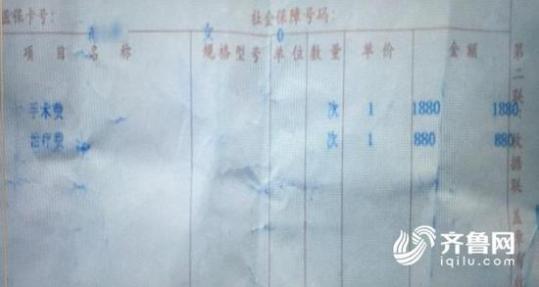 在蔣女士提供的單據上記者看到,彩超費、化驗費、檢查費是280元,打點滴一共花了256元,治療費880元、手術費1880元。各種費用相加,蔣女士在臨沂協和醫院總共花費3296元。然而,花了幾千塊錢后,這病卻沒治好。