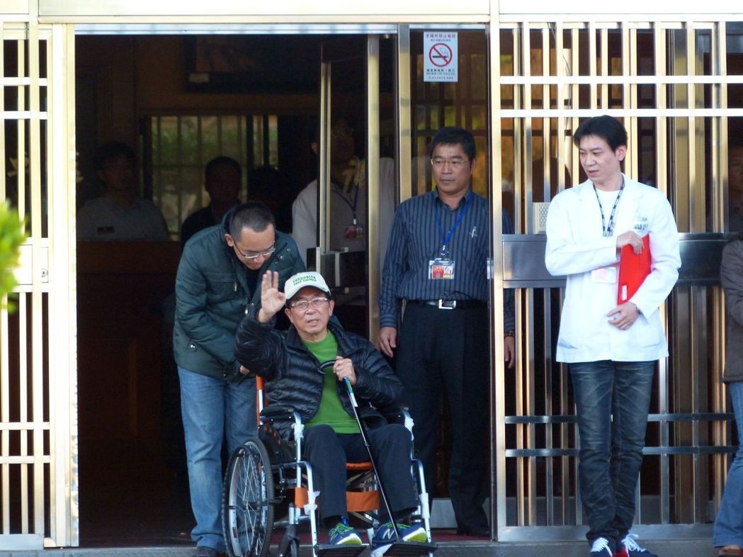 2015年陳水扁保外就醫,在兒子陳致中陪同下離開臺中監獄。(圖片來源:臺灣《聯合報》)