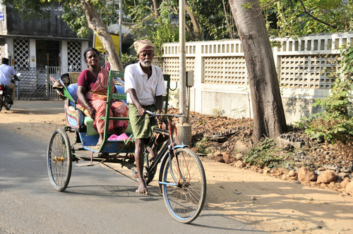 資料圖片:2013年1月11日,在印度本地治里市,一名老者腳踩人力三輪車搭載一名婦女在街上穿行。新華社記者 汪平 攝