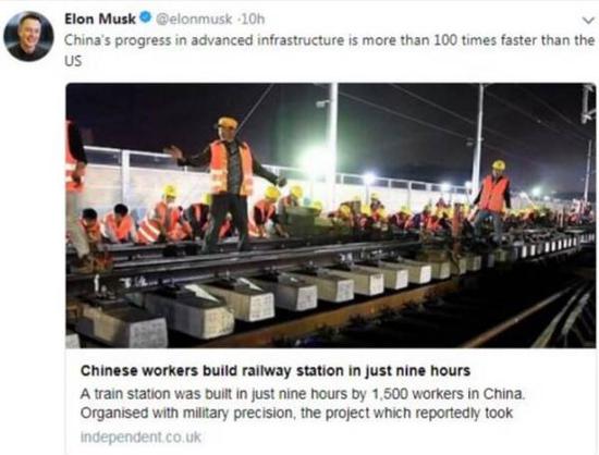 近年來,中國速度日益引發(fā)外媒關注。28日,一段中國工人在火車站施工的視頻又走紅美國,剛剛將跑車送上太空的企業(yè)家馬斯克(Elon Musk)也忍不住轉發(fā)贊嘆,“中國先進基礎設施發(fā)展速度比美國快了100多倍”。截至發(fā)稿,這條推文獲得7千多轉發(fā),3萬點贊,外國網(wǎng)民也展開討論,為中國速度點贊。(央廣網(wǎng))