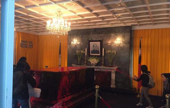 有“獨派”團體將紅漆潑灑在蔣介石棺柩上。(圖片來源:臺媒)