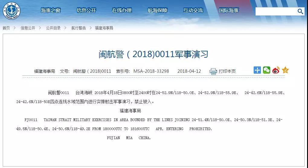 中國福建海事局消息,解放軍將于18日在臺灣海峽進行實彈射擊軍事演習。(福建海事局網站)