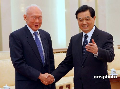 資料圖:二00七年十一月十六日,中國(guó)國(guó)家主席胡錦濤在北京人民大會(huì)堂會(huì)見(jiàn)來(lái)訪的新加坡內(nèi)閣資政李光耀。 中新社發(fā) 任海霞 攝
