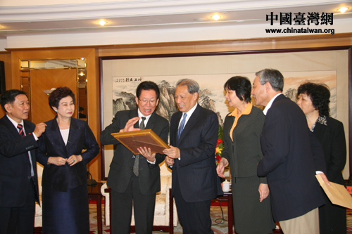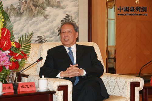 中國(guó)和平統(tǒng)一促進(jìn)會(huì)副會(huì)長(zhǎng)成思危與參訪團(tuán)團(tuán)長(zhǎng)馬劍波親切交談。