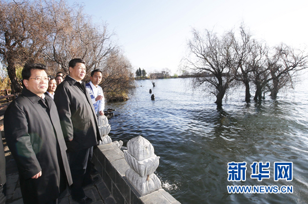 2015年1月20日,習近平來到大理白族自治州大理市灣橋鎮古生村,仔細察看洱海邊的生態保護濕地。 新華社記者 鞠鵬 攝