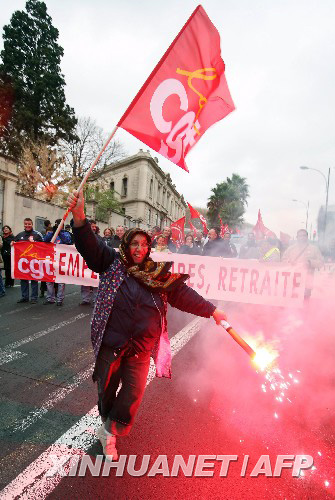 11月20日,在法國蒙彼利埃,一名女子揮舞法國總工會的旗幟參加游行。法國八大公務員聯合會當日發起預定24小時的罷工,將已經持續一周的法國大罷工推入新階段。這次公務員罷工的目的是要求政府增加工資,并抗議政府作出的2008年取消2.29萬公務員職位的決定。 新華社/法新
