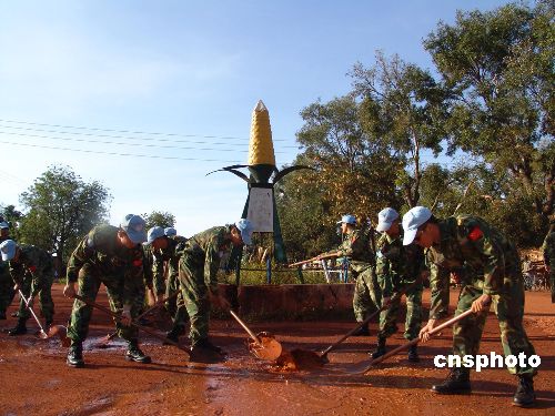 10月24日上午,在蘇丹瓦烏大學校區(qū),濟南軍區(qū)第三批赴蘇丹維和工兵部隊為駐地提供義務勞動,與各出兵國維和部隊、當?shù)卣黄饝c祝“聯(lián)合國日”。 中新社發(fā) 隗章 攝