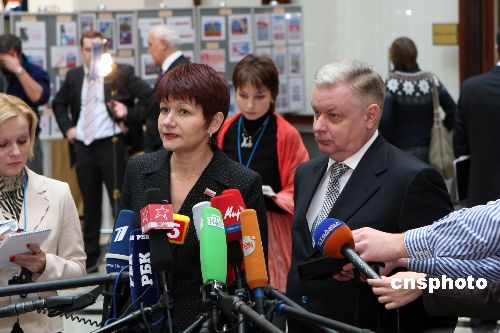 十二月二日,俄羅斯選民前往各投票站,參加俄第五屆國家杜馬選舉投票。據俄中央選舉委員會介紹,此次選舉吸引一千五百余家俄羅斯及外國媒體報名參加報道。圖為俄中選委成員安娜·庫利亞索娃和俄聯邦移民局官員康斯坦丁·羅莫丹諾夫斯基,向媒體介紹國家杜馬選舉的進展情況。 中新社發 田冰 攝