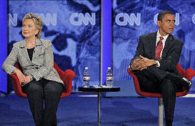 民主黨總統(tǒng)候選人希拉里(左)和奧巴馬在辯論會上(右)交鋒。IC圖