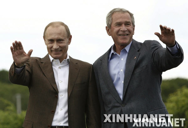 資料圖片:7月1日,在美國東北部緬因州肯納邦克波特,美國總統布什與到訪的俄羅斯總統普京一起揮手致意。 新華社發