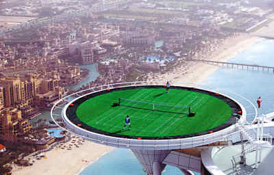 據迪拜朋友講,入住酒店的客人,一出迪拜機場就有酒店提供的兩種“豪華選擇”:坐勞斯萊斯豪華轎車過去,或是乘直升機。乘機前往的話,在15分鐘的航程里,可以從高空鳥瞰迪拜市容,然后徐徐降落在酒店28層的直升機停機坪上。當然,這種高檔享受是要付出高昂代價的。在酒店的樓頂,還有一個世界獨一無二的“空中網球場”,它由直升機停機坪改建而成,距地面300多米。著名的網球選手費德勒和阿加西,就曾為備戰迪拜男子網球公開賽,在這里打過友誼賽。